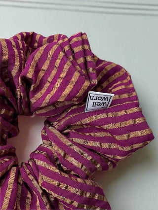 Yellow and white striped scrunchie with red accents on a wooden surface