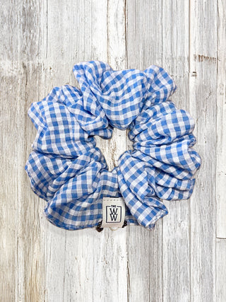 Two checkered scrunchies, one pink and yellow, one blue and white, on a light wooden surface.