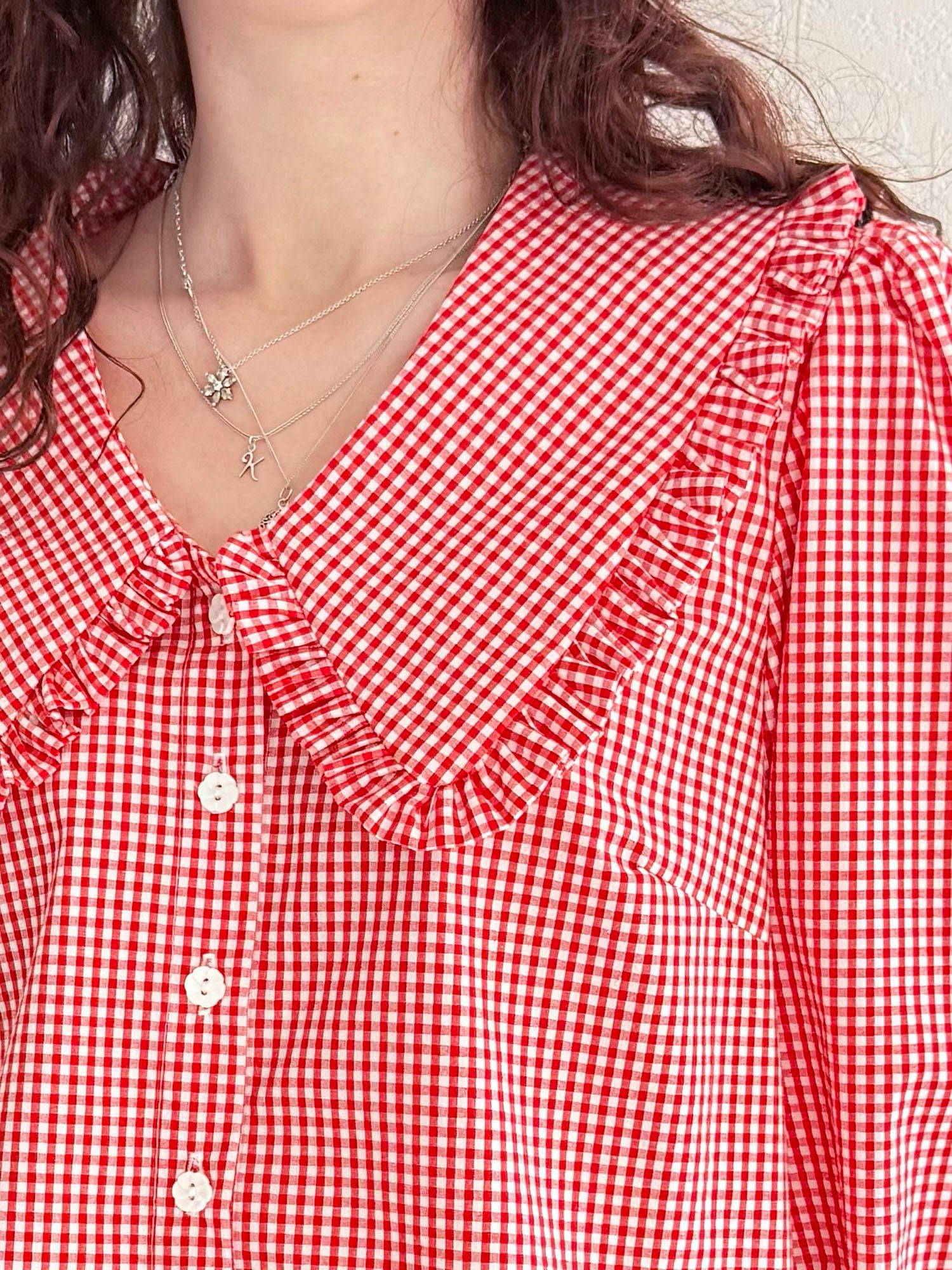 The Luna Red Gingham Blouse is all about timeless style with a fresh, fun twist. Featuring an oversized collar, puff sleeves, and vintage buttons, it’s the perfect blend of effortless cool and considered design.