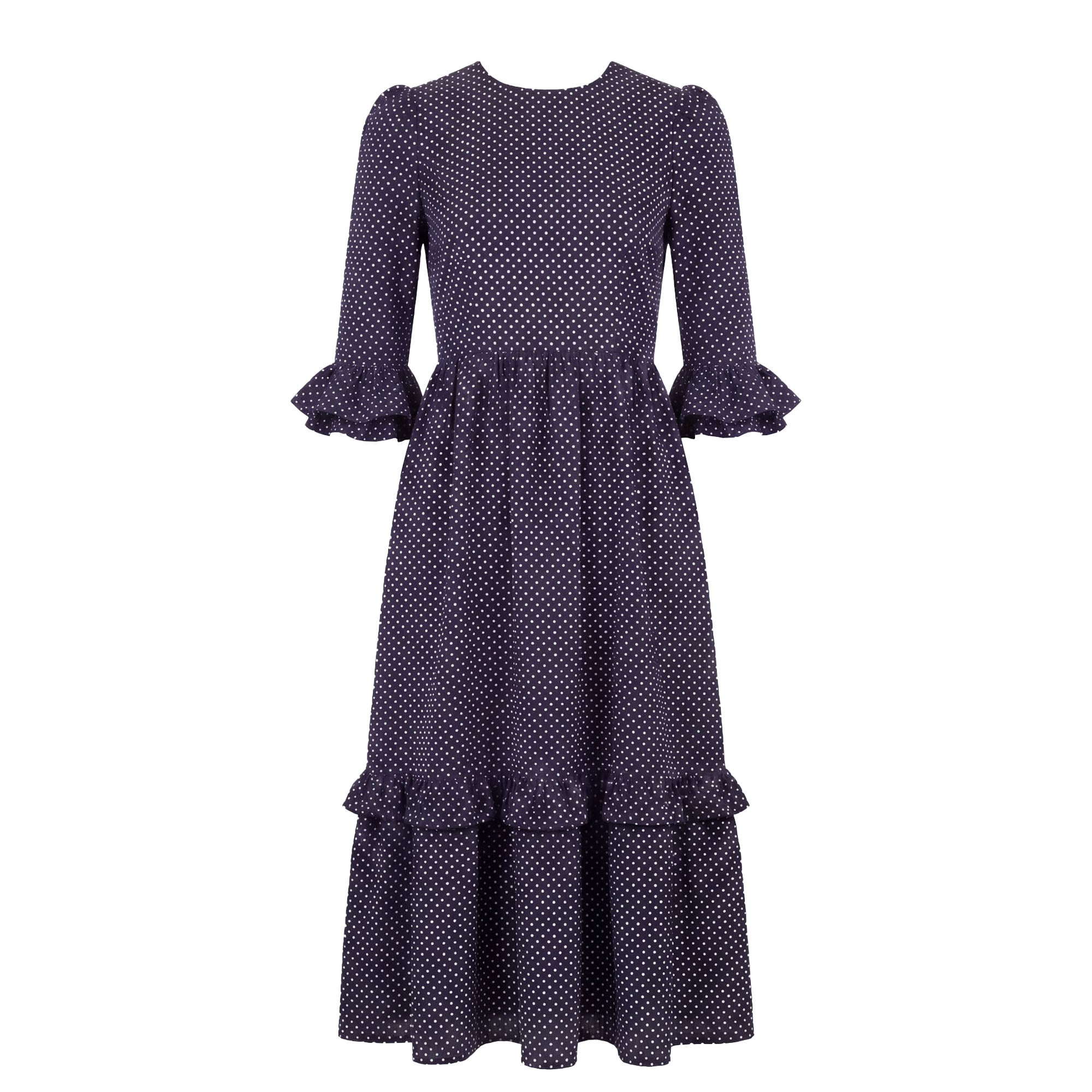Classic yet playful, The Felicity Dress is cut from reclaimed deadstock cotton in timeless navy with a scattering of white spots. A round neckline and softly puffed sleeves with ruffle cuffs frame a fitted bodice, falling into a tiered midi skirt with gentle movement. Concealed centre-back zip and hidden side pockets keep the finish clean and practical.