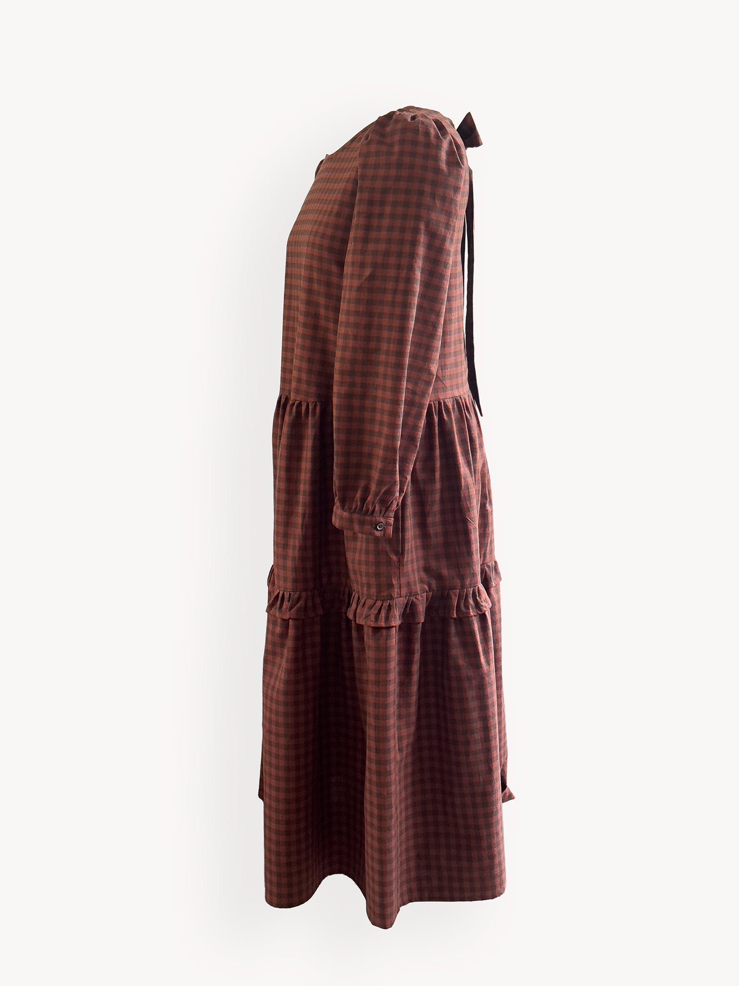 A new take on our signature Violet Dress, now in deep burgundy gingham. Crafted from organic cotton in our Hampshire, it blends ease and elegance with softly puffed sleeves, a gathered skirt and a back neck bow for a quietly romantic finish.