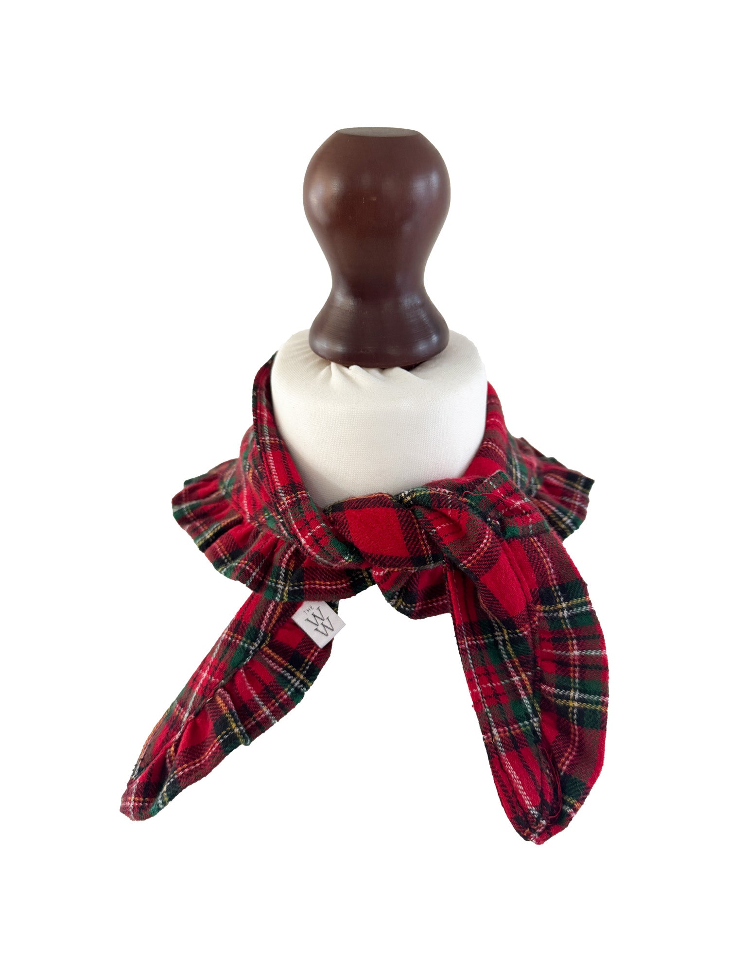 Details: Red Stewart tartan | Hand-ruffled edge | Easy-drape triangle shape | Made in Winchester, England | Limited edition