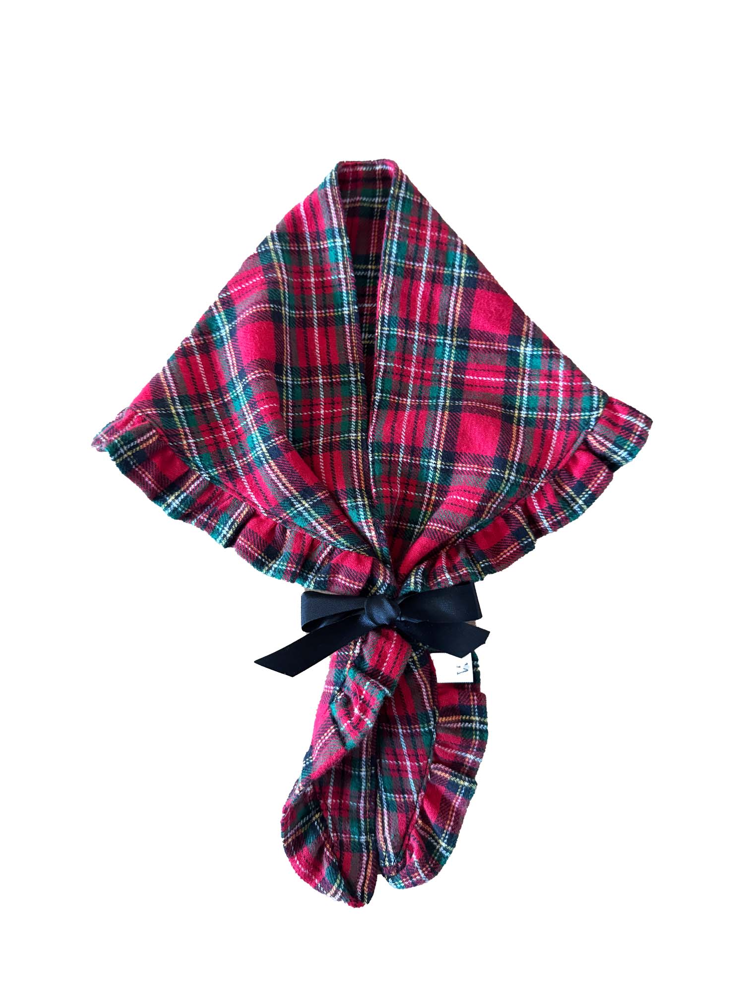 A soft, cosy layer for colder days, this triangle scarf is cut in classic woven tartan for a blend of heritage warmth and modern comfort. The shape drapes effortlessly, finished with a hand-ruffled edge that adds a nostalgic touch. Wrap it snugly around your neck for everyday wear — or style it as a sweet bib or pet neckerchief.