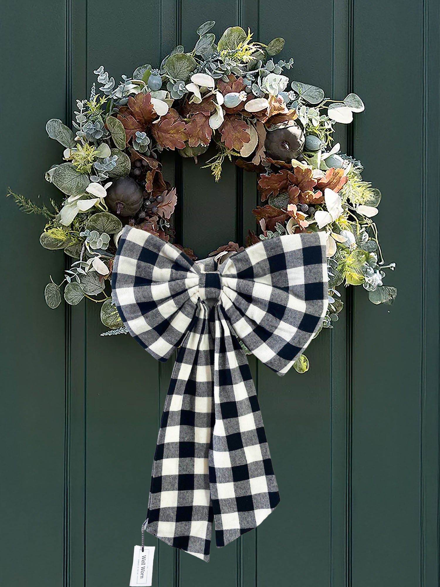 Introducing our Oversized Sustainable Bows, ethically handmade in the UK using deadstock and sustainable fabrics. Each bow is softly padded to maintain its shape, offering a luxurious, voluminous look for your seasonal decor. These versatile bows feature a small hanger loop, allowing them to be easily hung on a wreath, wall, or door—perfect for adding a sustainable touch to any space.