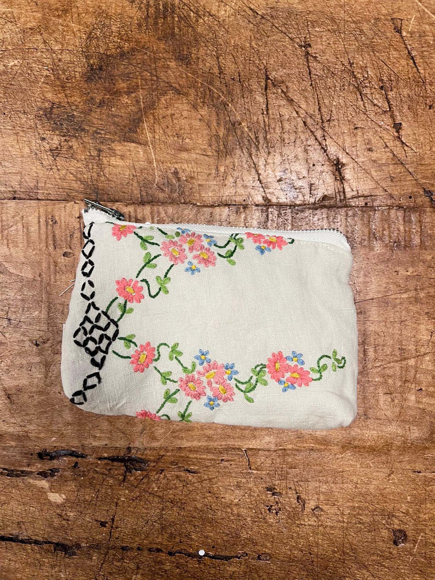 Practicality stitched with history. The Sienna Pouch has been lovingly handmade in our Winchester studio using rescued vintage embroidered table linens. Each one is completely unique, showcasing delicate floral needlework that once graced a table and is now given new life as a carry-everywhere pouch.