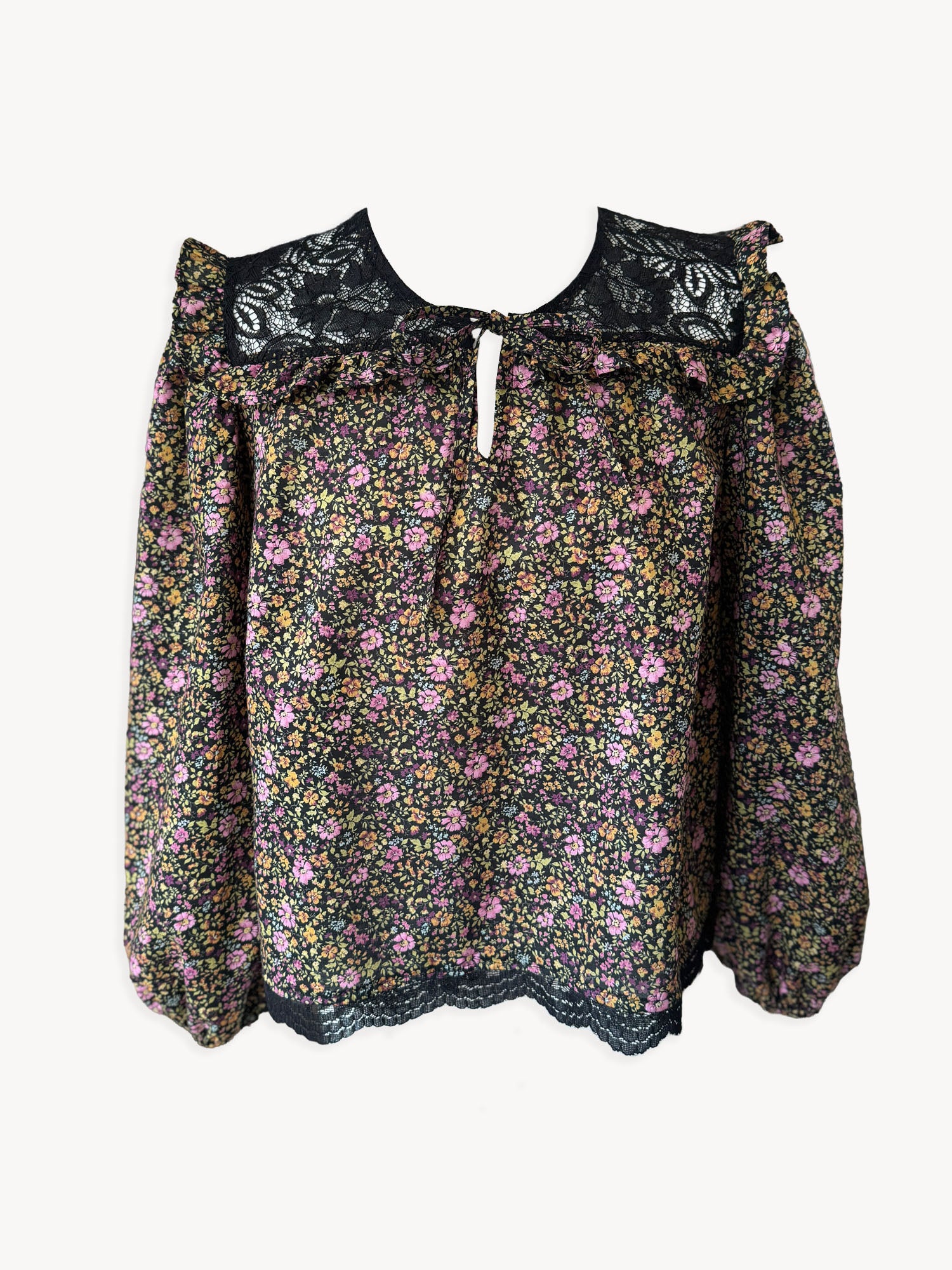 Romantic yet easy to wear, The Bella Top is made in Hampshire from 100% Japanese cotton printed with a delicate ditsy floral in soft autumnal tones. The black lace yoke and hem add a touch of vintage charm, while soft gathers through the body and sleeves create a relaxed, flattering silhouette.