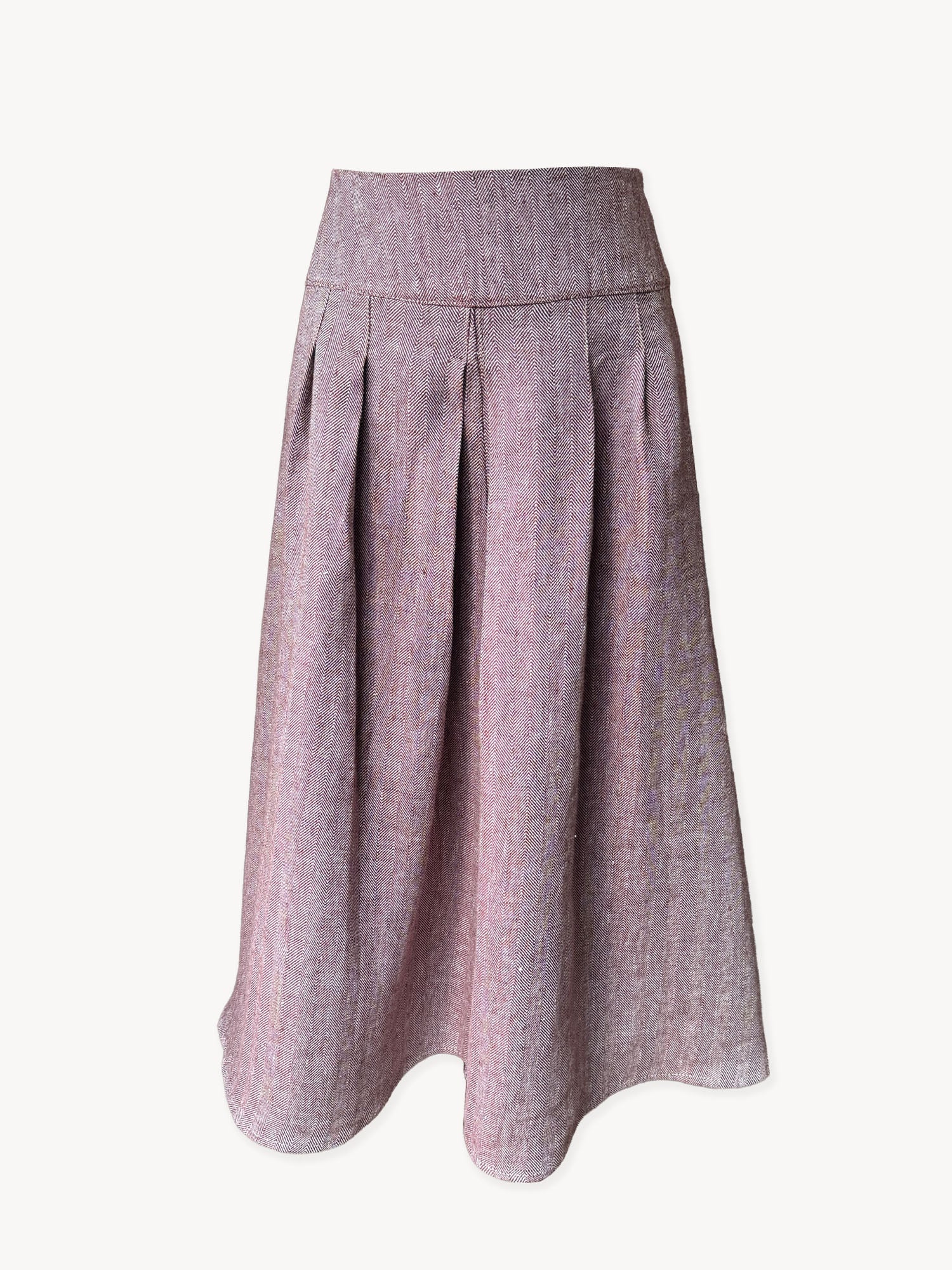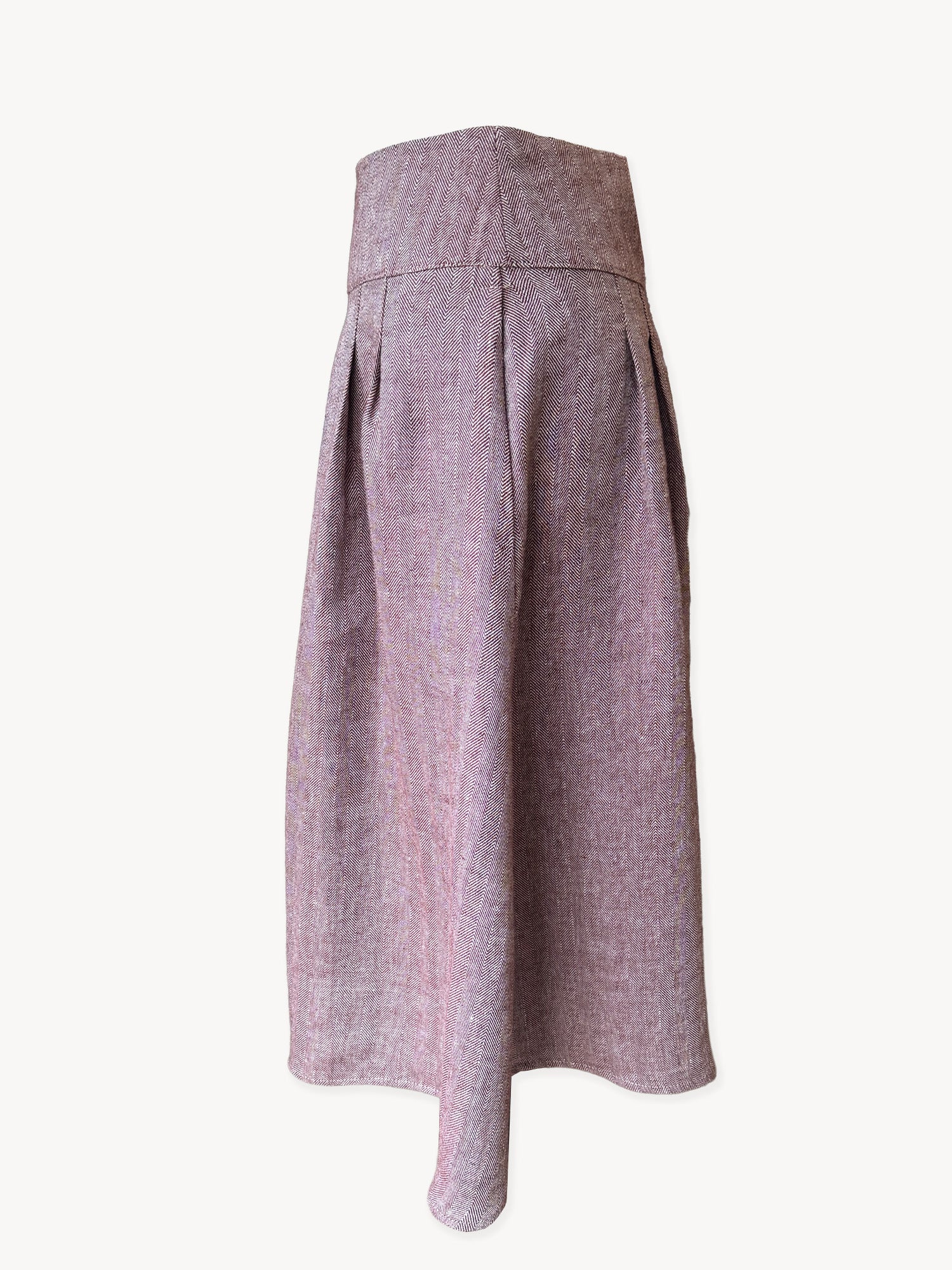 A beautifully structured midi skirt designed for effortless everyday wear. The Dune Skirt is made in Hampshire from 100% cotton woven in a soft burgundy and off-white herringbone — a timeless weave with a subtle texture and gentle movement.