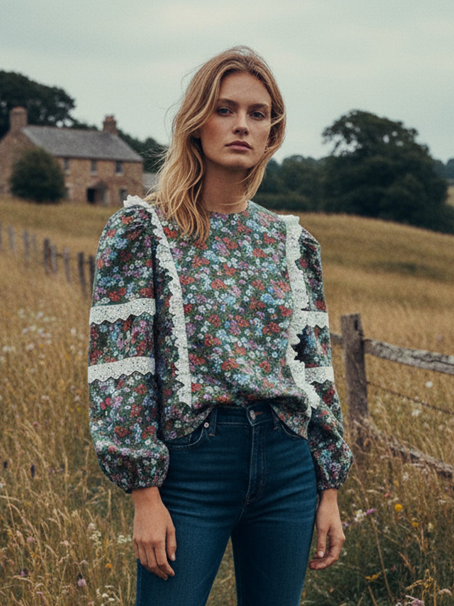 The Suki Blouse returns in vibrant deadstock 100% cotton, scattered with painterly florals in jewel tones. True to its vintage-inspired roots, it features romantic puff sleeves, a simple round neckline, and delicate ruffles of French lace tracing the bodice and sleeves.