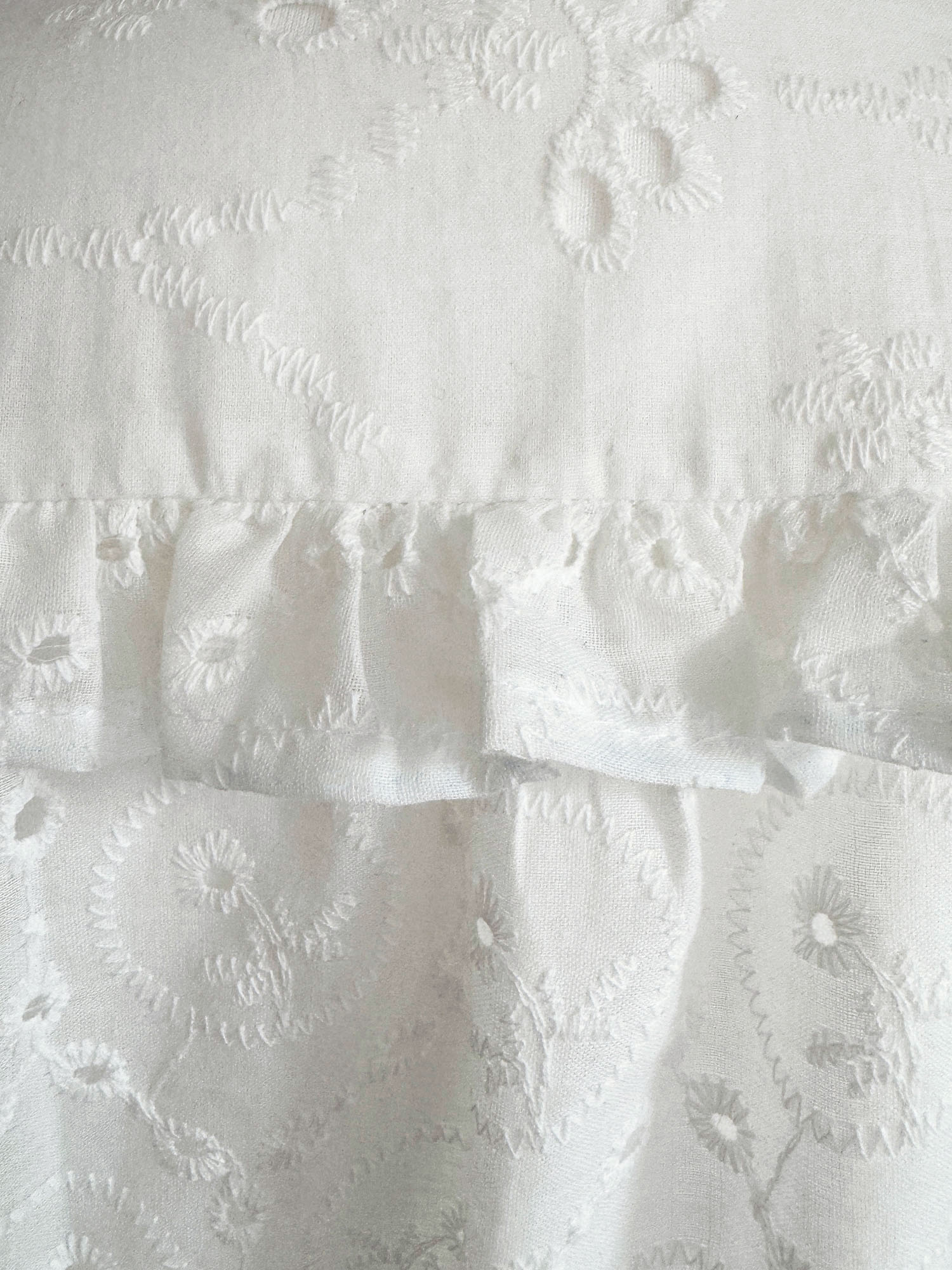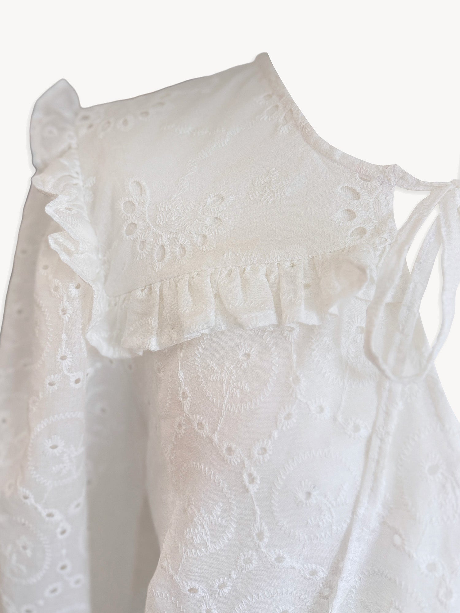 The Bella Blouse is a fresh Well Worn style, crafted in the UK from two delicate broderie cotton fabrics that layer pattern and texture with subtle charm. Its statement collar, trimmed with ruffles, ties neatly at the neckline, while softly gathered sleeves taper into elasticated cuffs for comfort.