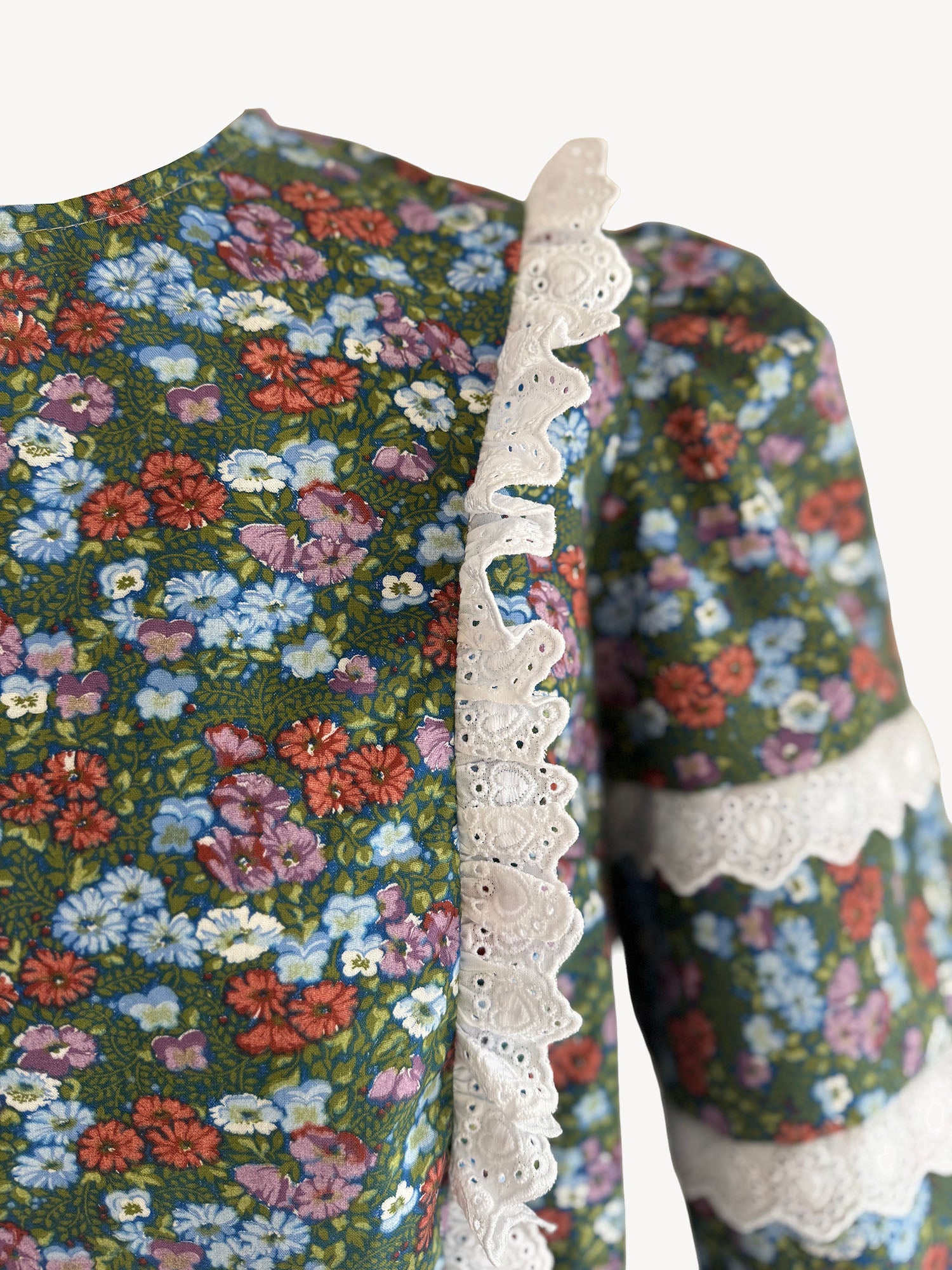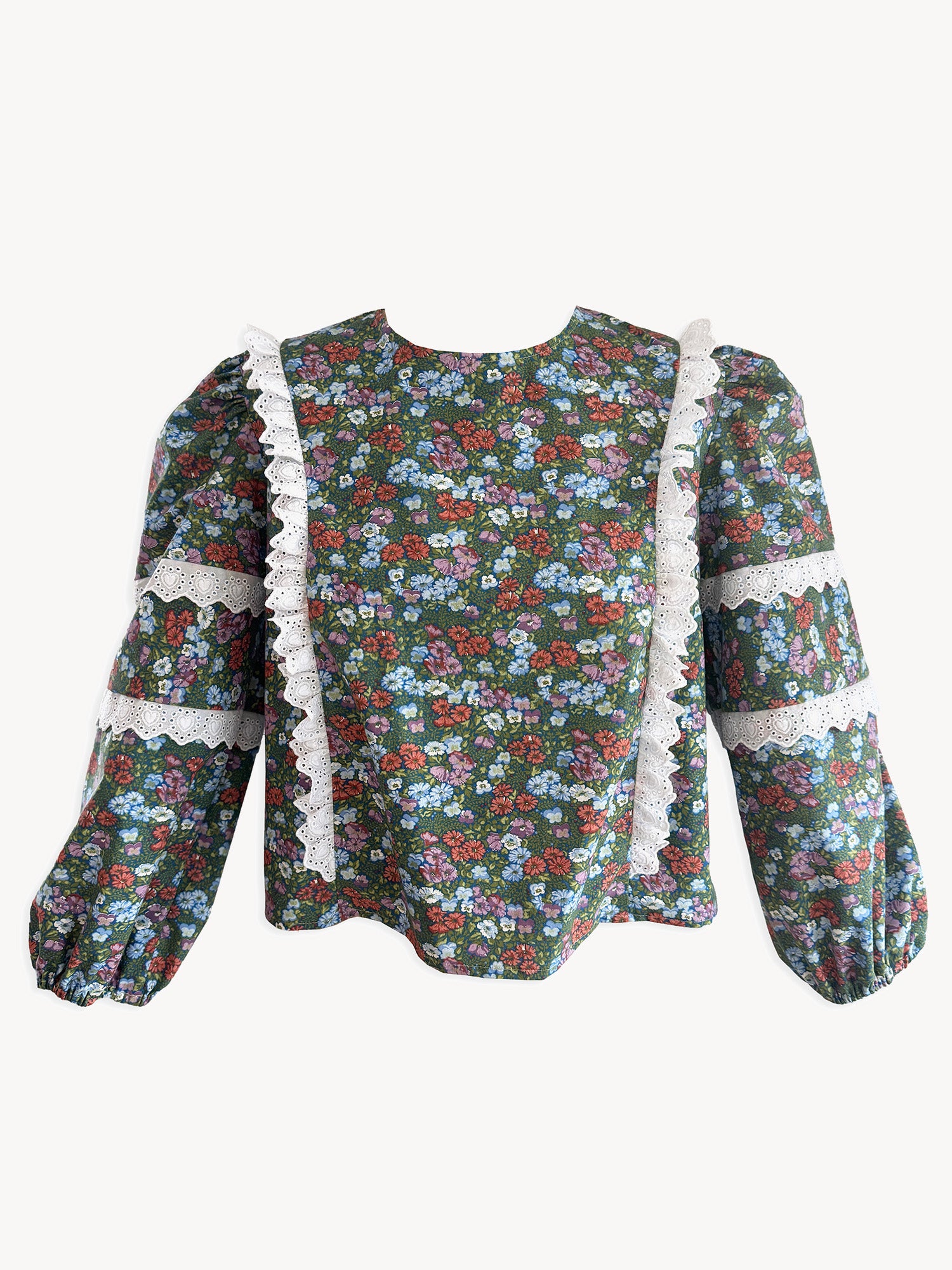 The Suki Blouse returns in vibrant deadstock 100% cotton, scattered with painterly florals in jewel tones. True to its vintage-inspired roots, it features romantic puff sleeves, a simple round neckline, and delicate ruffles of French lace tracing the bodice and sleeves.