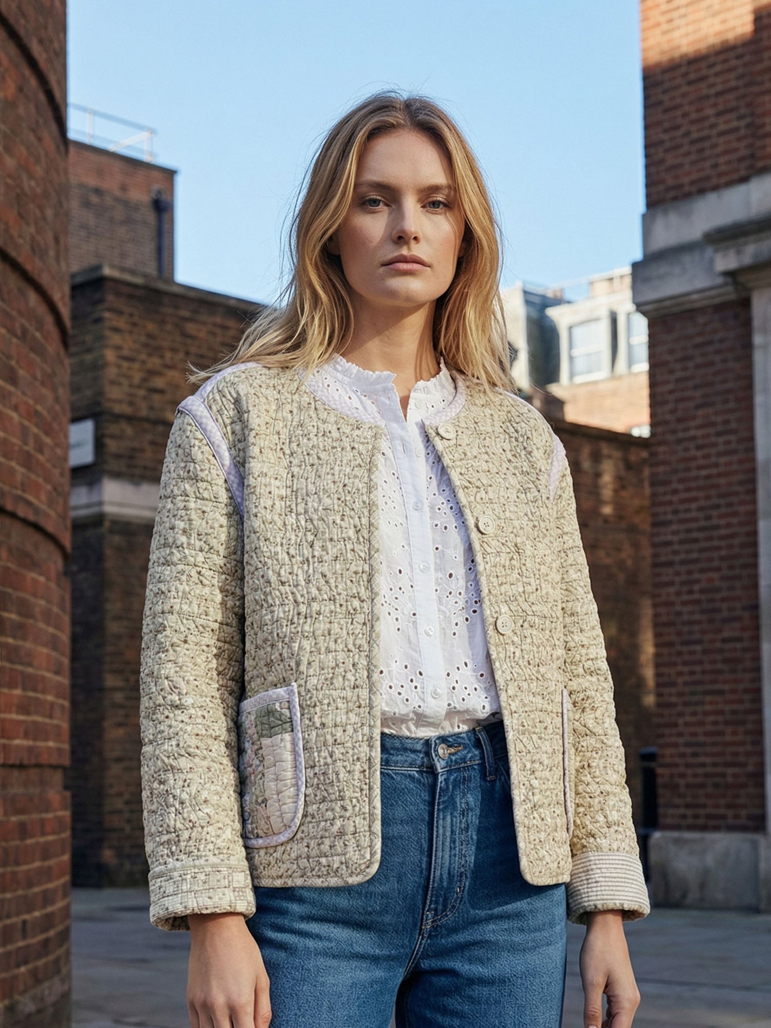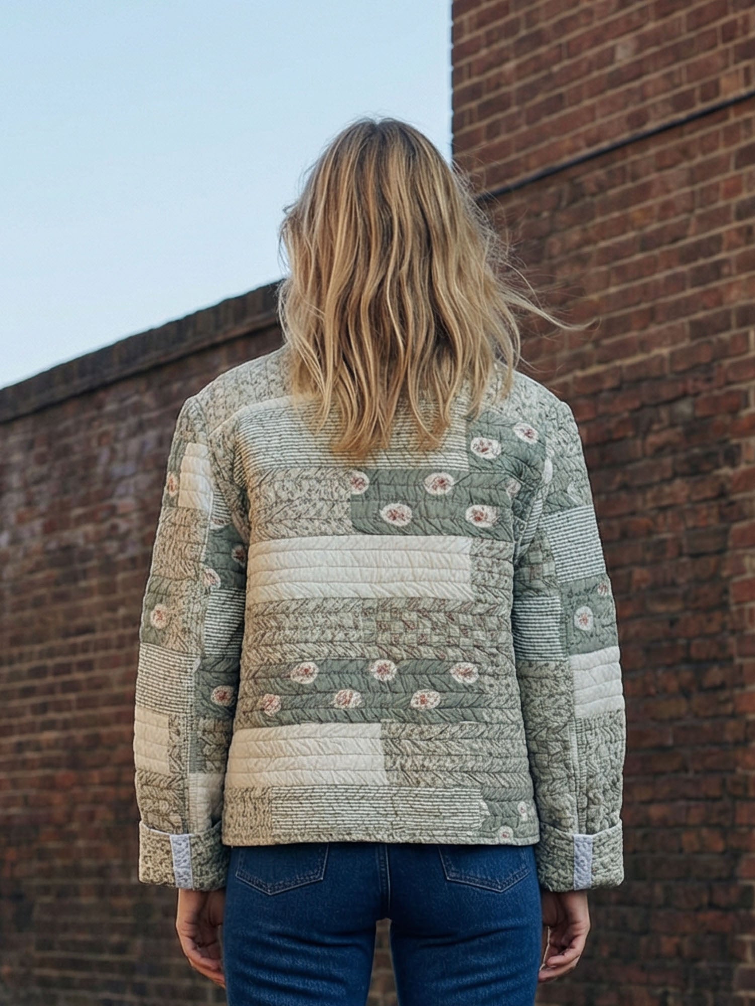 The Chloe Jacket is a fully reversible quilted jacket cut from an original vintage quilt in sage, cream and soft floral tones. A curved hem, contrast bound seams and hand-sewn poppers define a silhouette that feels both structured and relaxed.
